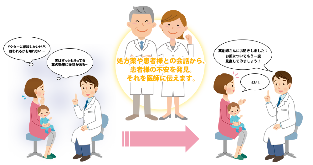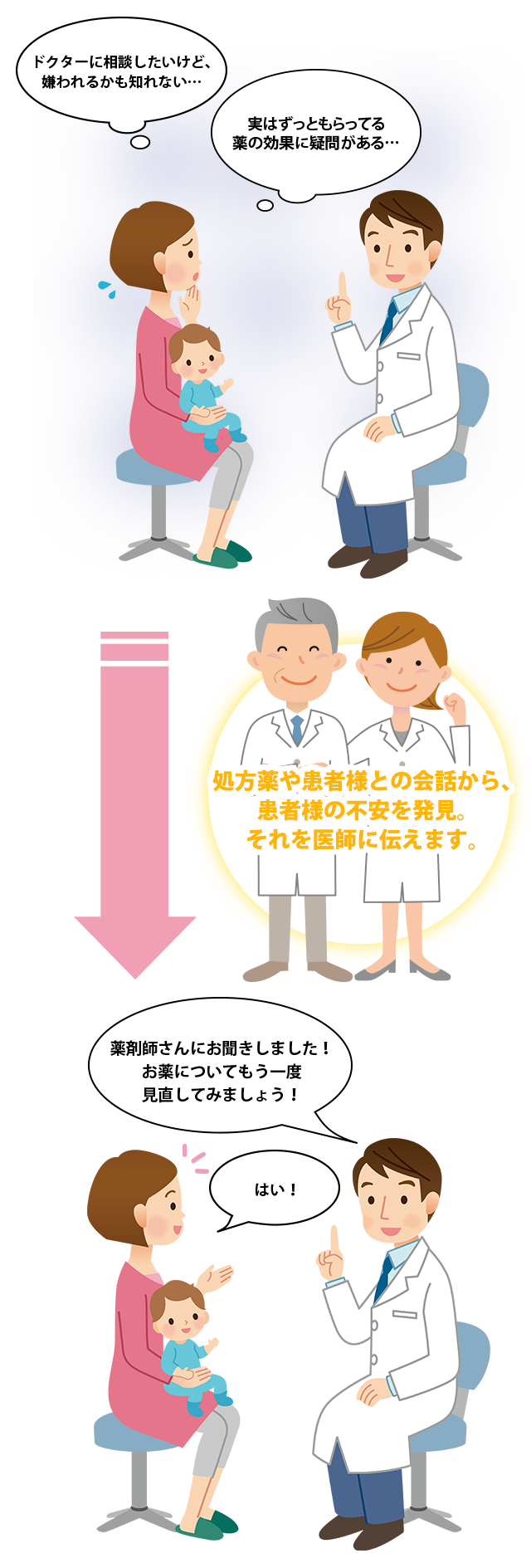 「漢方薬を試してみたい。」「ドクターから処方されたが飲んでいない薬があるのでやめたい。」など、ドクターには遠慮してなかなか言いにくいことを、薬剤師に言えるという点です。患者様からの本音を聞いた薬剤師は、ドクターにその意思を伝えます。その結果、患者様の納得のいく医療を提供することができるなど、薬局が患者様を有益な方向に導く「道しるべ」になることができます。