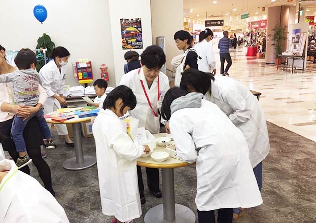 薬剤師という仕事に興味を持ってもらうため、アイ薬局のキャラクター「うらぴょん」と一緒に、保育園や小学校に行き、実際に薬の調剤を体験してもらっています。調剤用の薬には、ドロップなどを使います。